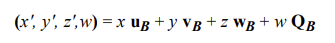 잘 보면 벡터 (x, y, z, w) 와 u, v, w, Q를 각각 행벡터로 꽂아 넣은 4x4 행렬의 곱셈으로 식을 변환할 수 있다.