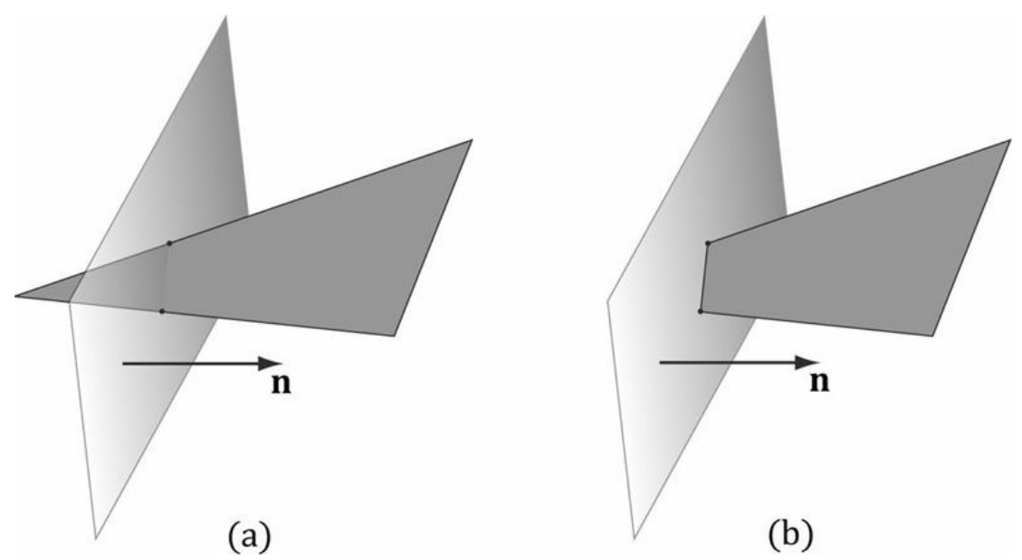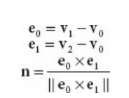 이 두 면을 구분하기 위해 삼각형의 꼭짓점을 이용하여 삼각형의 법선 n을 다음과 같이 계산한다.