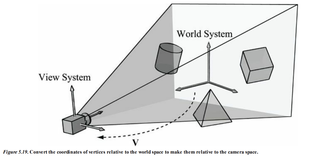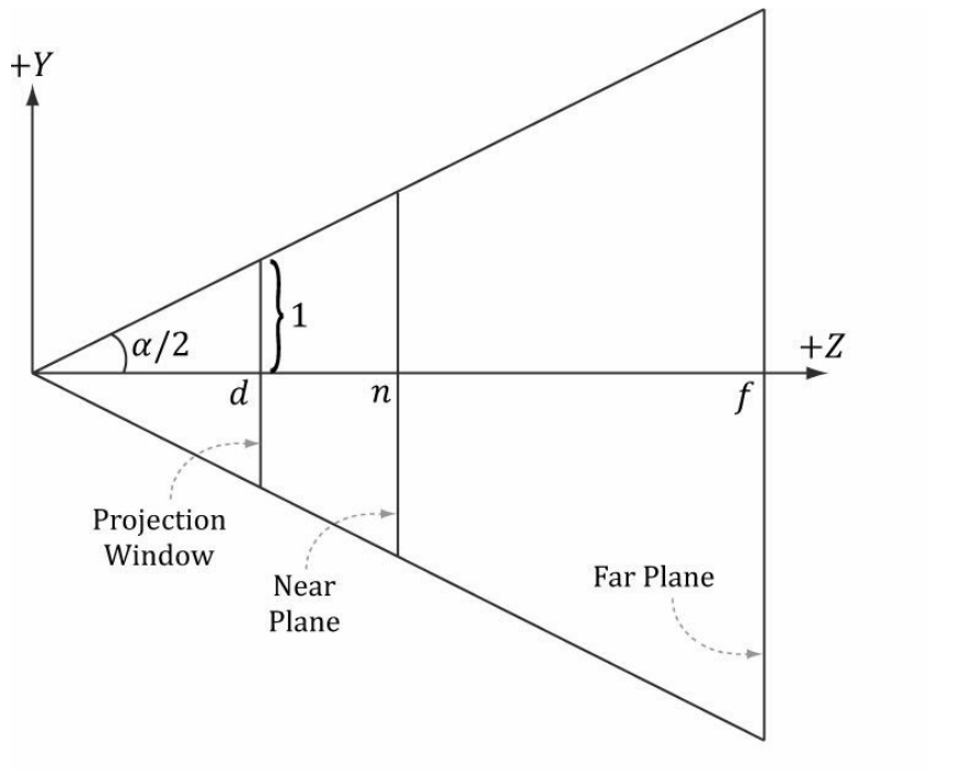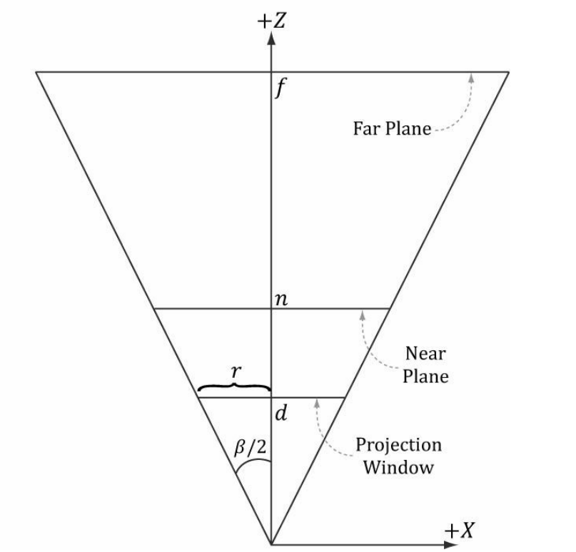 외 그림에서 왼쪽이미지는 카메라가 위치하고 조준된 3D 월드의 객체들의 측면 뷰를 보여준다.