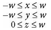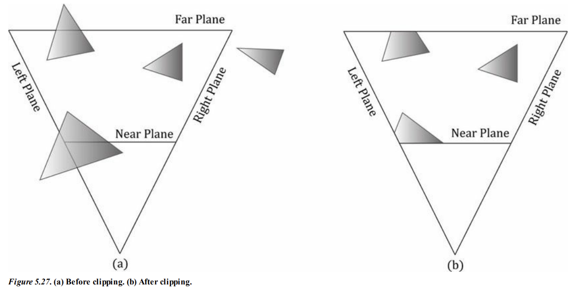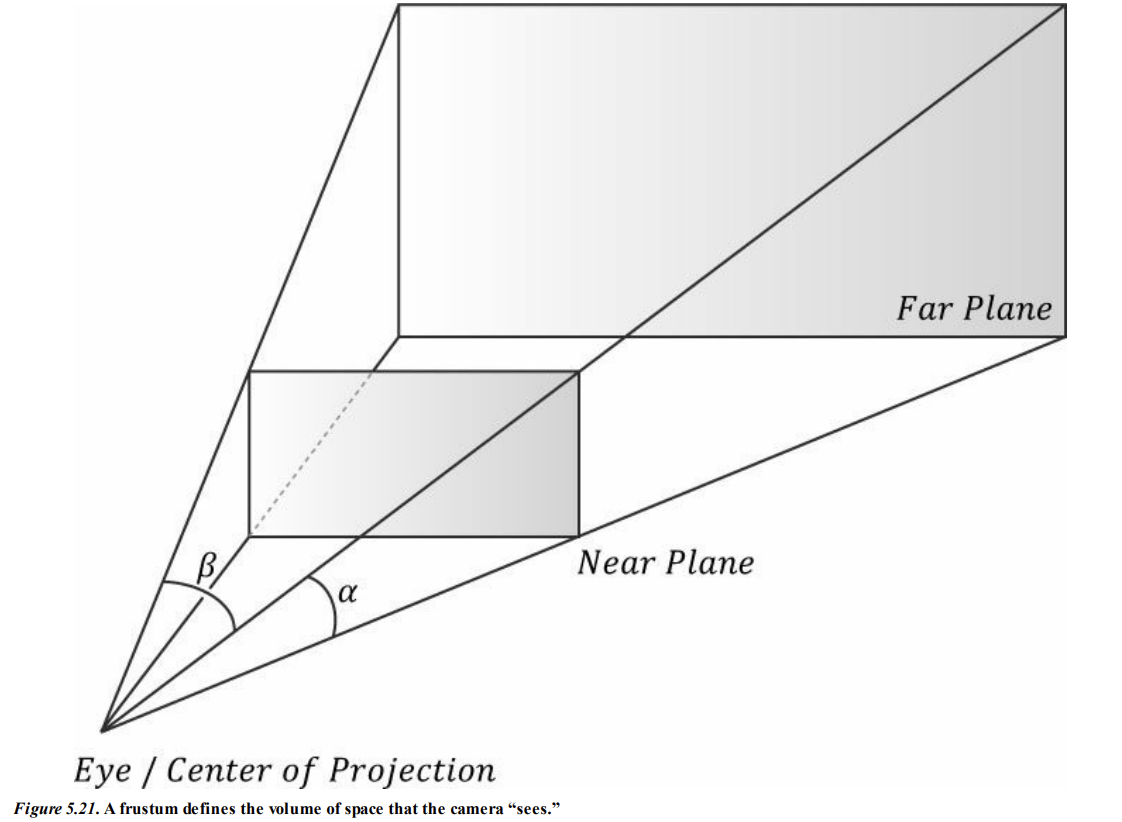 카메라의 시야 (피라미드 모양, 혹은 절두체라고 부름) 은 볼 수 있는 공간의 부피 (가시부피)를 나타내며, 해당 공간 외부에 있는 객체는 보이지 않는다.