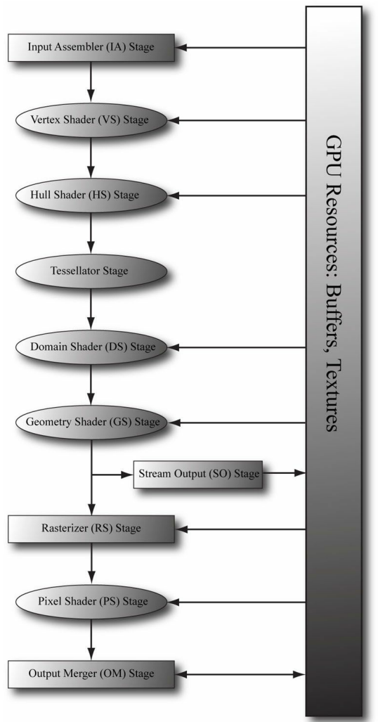 렌더링 파이프라인의 단계를 보여주는 위 그림은 GPU 메모리 리소스의 흐름도 설명해준다.