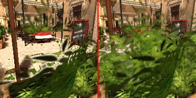 MASS가 도움이 될 수 있다고 생각할 수도 있는데, MSAA는 픽셀 중심에서 픽셀 쉐이더를 한 번 실행한 후, 가시성과 커버리지 정보를 서브픽셀들과 공유한다. 여기서 중요한 점은 커버리지가 폴리곤 레벨에서 결정된다는 것이다. 따라서 MSAA는 알파 채널로 정의된 나무 빌보드 컷아웃의 가장자리를 감지하지 못하고, 텍스처가 매핑된 사각형의 가장자리만 처리할 수 있다. 그렇다면 Direct3D가 커버리지를 계산할 때, 알파 채널을 고려하도록 할 수 있을까?