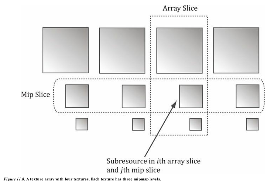 각 텍스처는 고유한 mipmap 체인을 가지고 있다. Direct3D API는 텍스처의 요소와 해당 요소의 전체 mipmap 체인을 가리킬 때 array slice 라는 용어를 사용한다. Direct3D API는 특정 레벨의 모든 mipmap을 가리킬 때 mip slice 라는 용어를 사용하며, 서브리소스는 텍스처 배열의 요소에서 단일 mipmap 레벨을 나타낸다.