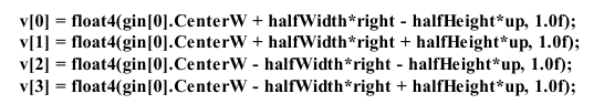 v[1] = float4(gin[0].CenterW + halfWidth*right + halfHeight*up, 1.0f);