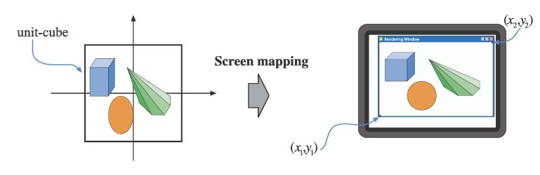 화면 매핑은 평행 이동 후 스케일링 작업을 통해 이루어진다. 변환된 x, y 좌표는 화면 좌표로 정의된다.