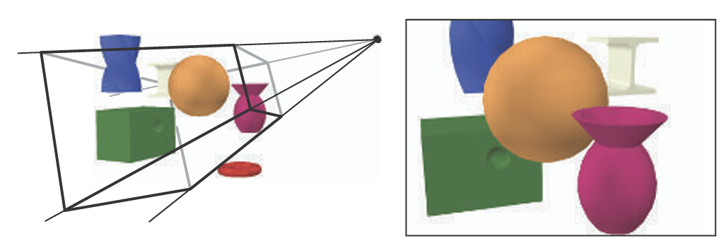 오른쪽 이미지는 카메라가 보는 모습을 보여준다. 왼쪽 이미지의 빨간 도넛 모양은 시야 프러스텀 외부에 위치해 있기에 오른쪽 렌더링에 포함되지 않는다. 또한, 왼쪽 이미지의 비틀린 파란 프리즘은 프러스텀 상단 평면에 잘려 나갔다.