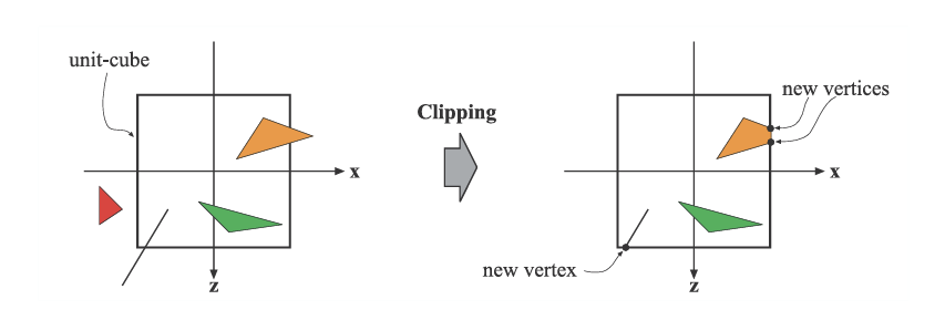 그 다음, 별도로 제공된 투영 행렬을 사용하여 객체를 단위 큐브 공간으로 변환한다. 이 단위 큐브는 눈에 보이는 장면을 나타낸다. 단위 큐브 바깥에 있는 모든 프리미티브는 폐기된다. 단위 큐브와 교차하는 프리미티브는 단위 큐브에 대해 클리핑되어 큐브 내부에 완전히 위치한 프리미티브 세트가 만들어진다.