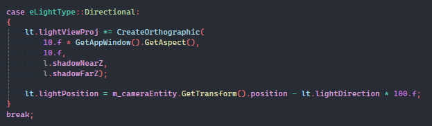 방향성 광원은 모든 광선이 서로 평행하기 떄문에 특정한 위치를 가지지 않는다. 하지만 그림자 매핑을 위해서는 광원의 서점에서 장면을 렌더링해야 하므로, 우리는 광원의 방향에 따라 임의의 위치에서 장면을 렌더링하는 방식으로 처리한다.