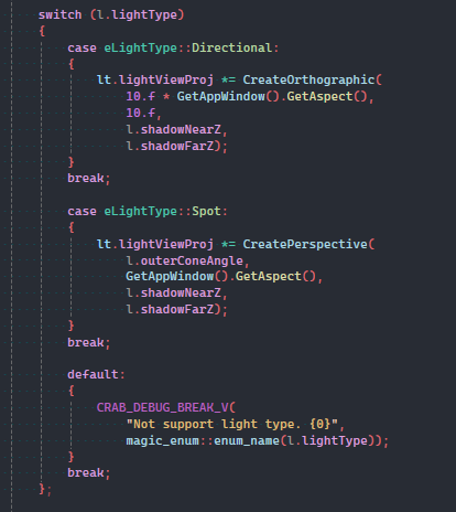 평행광을 쓴다면 직교투영 행렬을.. 스팟 라이트를 사용한다면 원근투영 행렬을 사용해야한다.