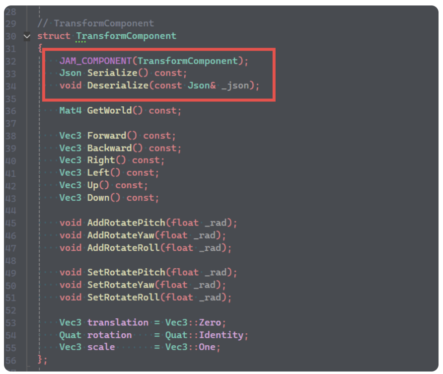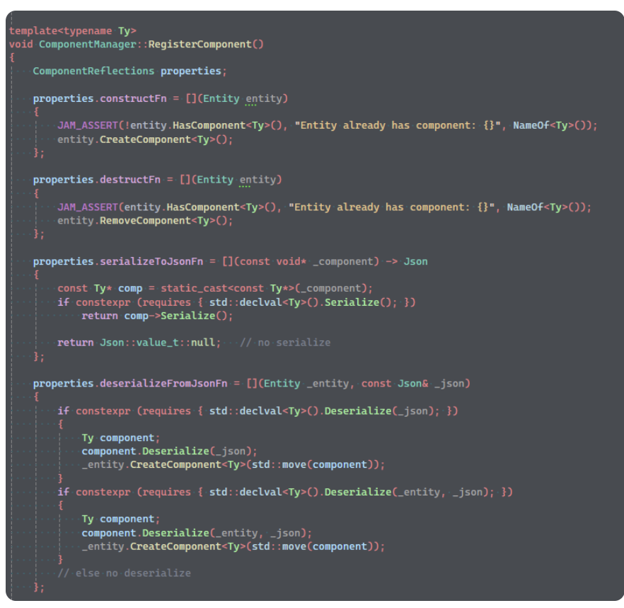 바꿀 수 없는 진실은 모든 컴포넌트가 직렬화 역직렬화 로직을 제공해야하며, 런타임에 추가 및 삭제를 제공해야한다는 점이다. 이를 위해서 컴포넌트들이 런타임 리플렉션을 제공하도록 매크로를 정의하였으며 매크로를 가지고 있지 않은 컴포넌트들이 있으면 아예 컴파일이 되지 않도록 막아버렸다.