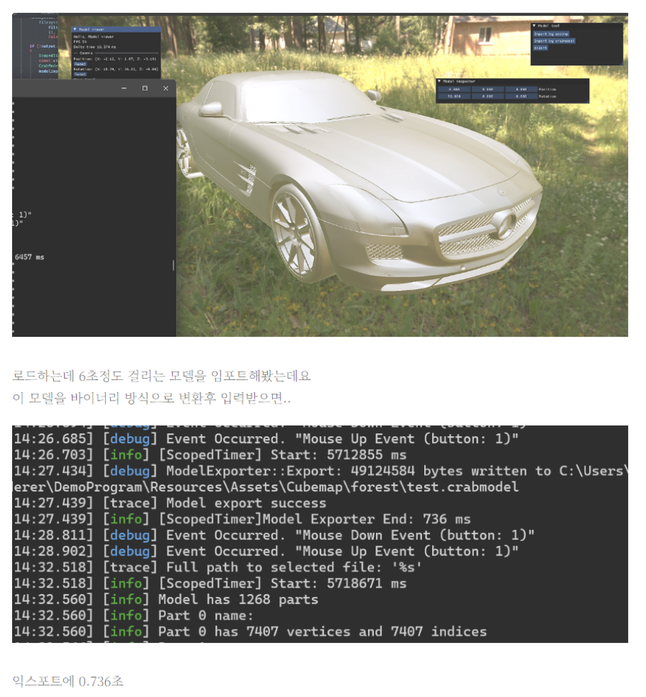 5초 정도의 로딩시간이 걸린다. 이를 개선하기 위해 엔진은 고유의 모델 구조를 사용하며 바이너리 코드 형태로 관리한다. 엔진에 내장된 ModelImporter은 외부 형식 모델을 로딩하여 엔진 표준 형식으로 바꿔준다. 이러면 로딩시간을 10배 ~