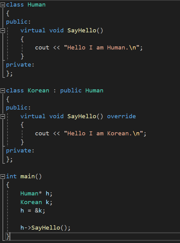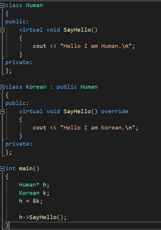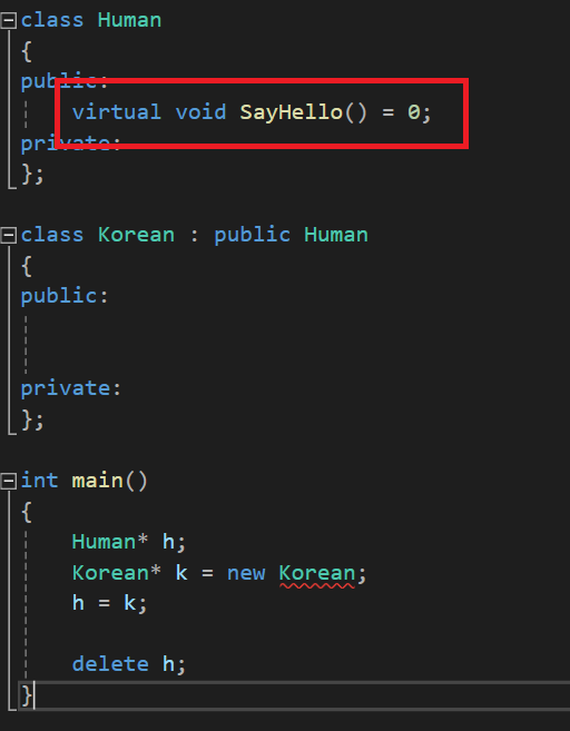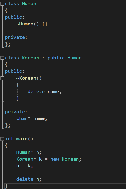 h의 겉모습은 Human이기에 Korean의 소멸자가 호출되지 않고 Human의 소멸자만 호출된 것입니다.