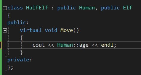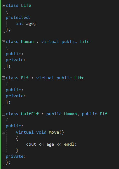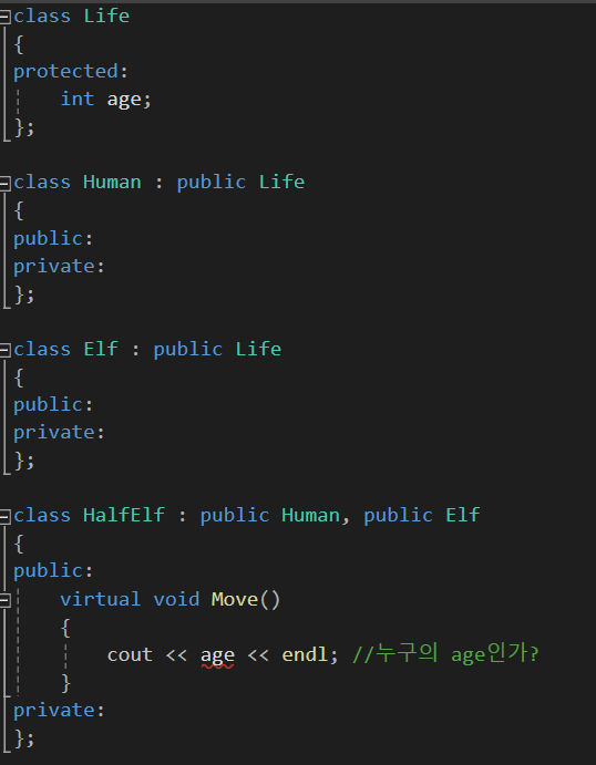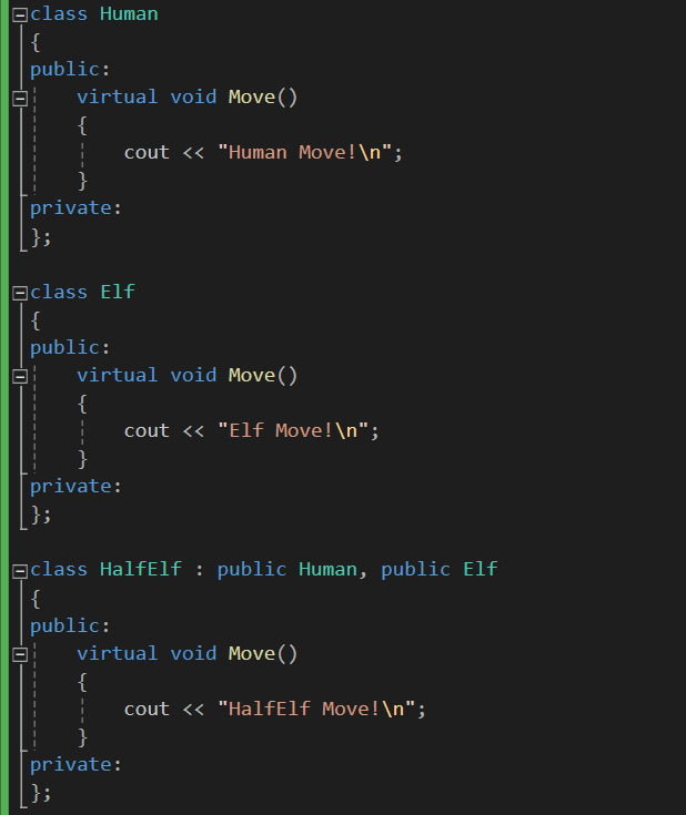 이러면 HalfElf 클래스는 Human의 멤버와 Elf의 멤버 둘 다 동시에 상속받을 수 있습니다.