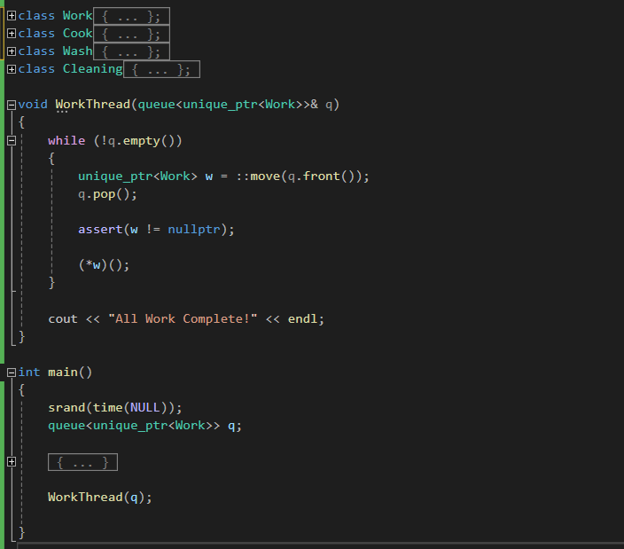 void WorkThread(queue<unique_ptr<Work>>& q)