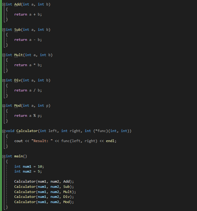 이런 식으로 함수 포인터를 이용하면 원하는 함수를 매개변수로ㄴ 전달하여 계산하는 계산기 프로그램을 만들 수 있습니다.