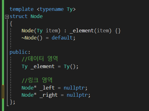 이런 식의 왼쪽 자식과 오른쪽 자식을 가리키는 노드 포인터를 링크 영역에 가지고 있고
