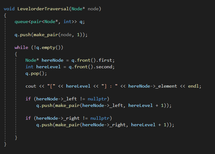 q.push(make_pair(hereNode->_left, hereLevel + 1));