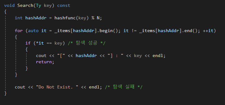 탐색도 해당 버켓에 접근해서 버켓의 연결리스트를 선형탐색하면 됩니다.