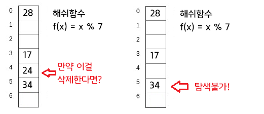 만약 3개의 충돌된 요소 중 가운데 요소를 삭제한다면, 3번째 요소를 찾을 방법은 없습니다.