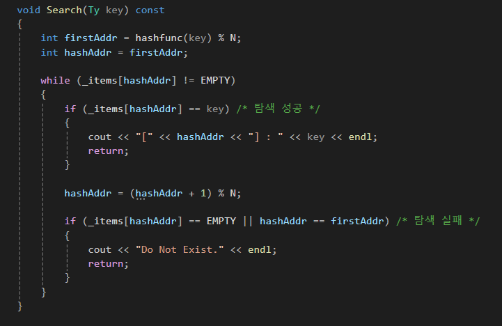 if (_items[hashAddr] == EMPTY || hashAddr == firstAddr) /* 탐색 실패 */