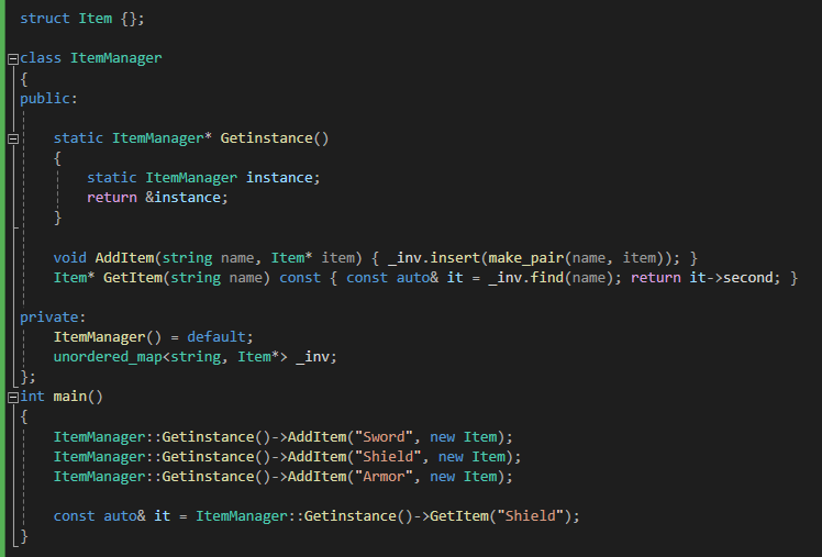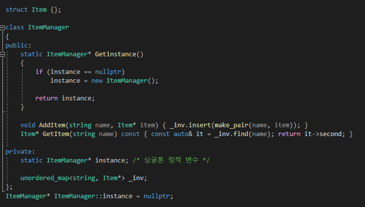 그리고 또 인벤토리는 하나의 프로그램에 단 하나만 존재해야하기 때문에 싱글톤으로 설계했습니다.