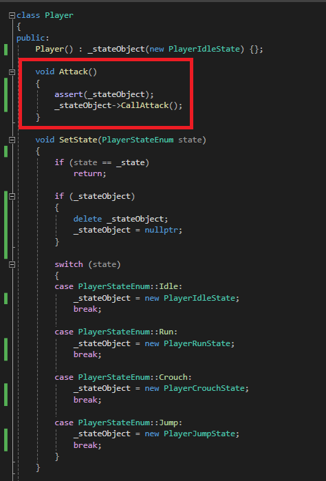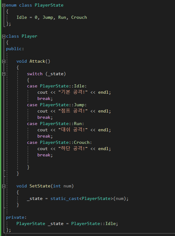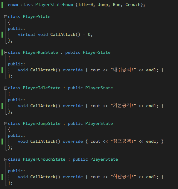 위 코드를 보면 상태에 따라 코드의 분기를 Player단에서 하지 않고,