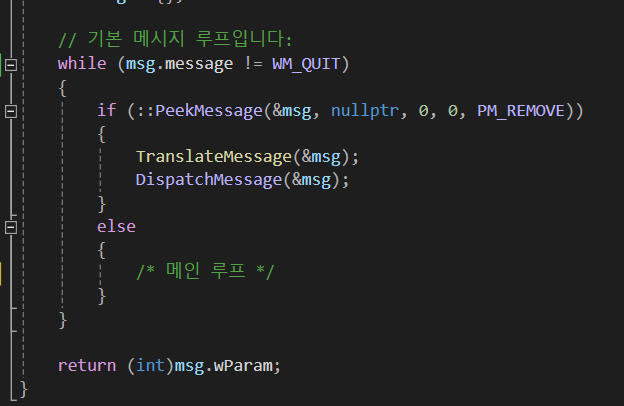 WM_QUIT 즉, '프로그램 종료'라는 메시지가 존재할 때만, 안전하게 루프를 탈출하고 프로그램을 종료한다는 의미입니다.