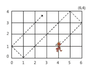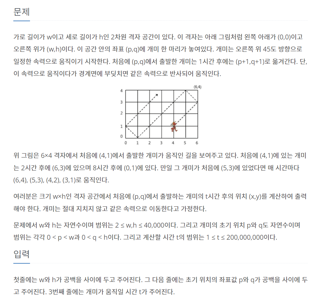 가로 길이가 w이고 세로 길이가 h인 2차원 격자 공간이 있다. 이 격자는 아래 그림처럼 왼쪽 아래가 (0,0)이고 오른쪽 위가 (w,h)이다. 이 공간 안의 좌표 (p,q)에 개미 한 마리가 놓여있다. 개미는 오