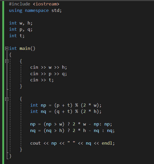결과 값이 w를 넘었을 경우 2*w에서 해당 좌표를 뺀 값이 정답이고