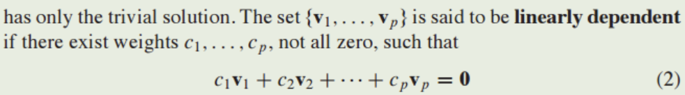 그러나 c1, c2, ... , cp 중 하나라도 0이아닌 계수를 가지고 있으면 선형 종속이라고 합니다.