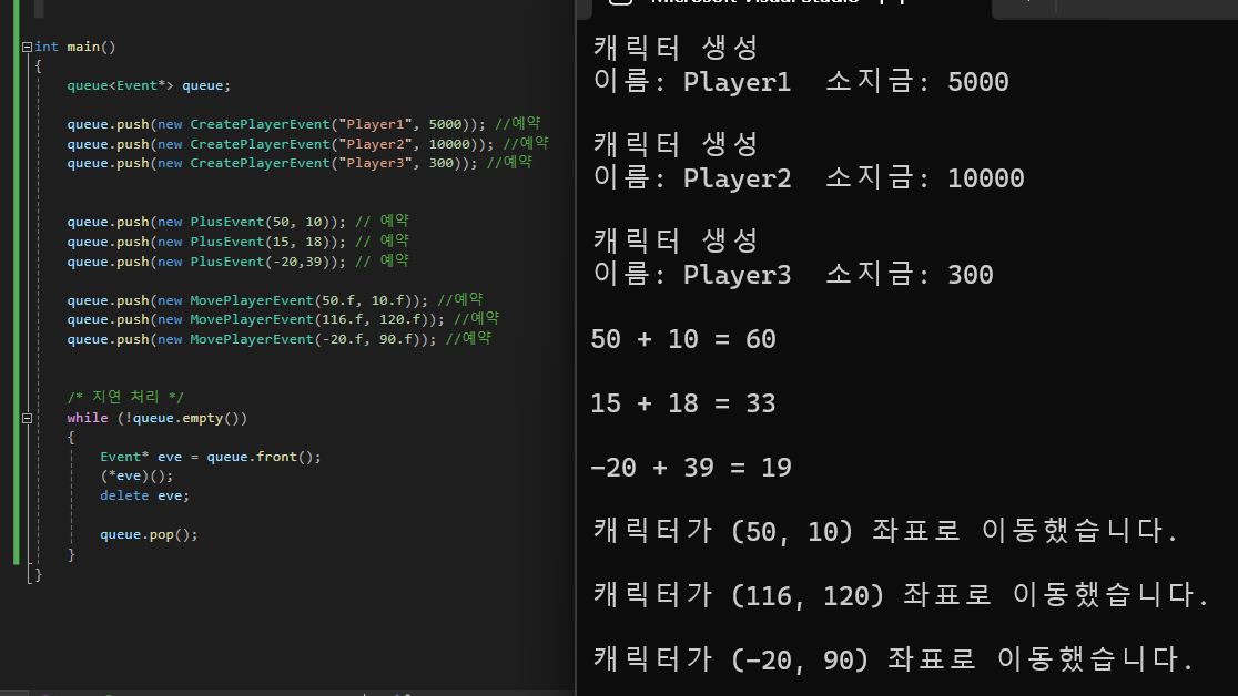 (함수주소, 매개변수 압축)을 쌍을 큐에 저장하는 방법이죠.
