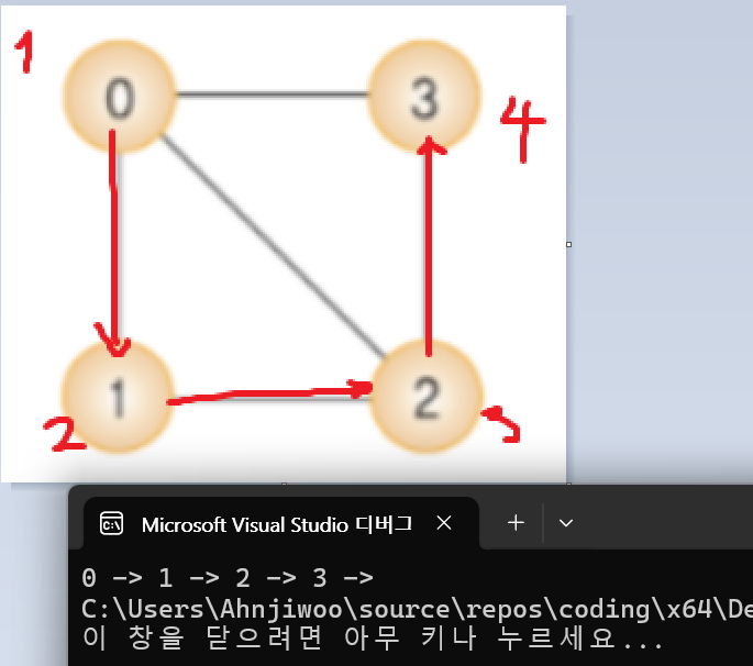 만약 없으면 종료하고 있다면 다시 그 정점을 시작 정점으로 하여 깊이 우선 탐색을 다시 시작한다.
