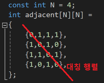 우리가 다루고 있는 그래프에서는 자체 간선을 허용하지 않으므로 인접 행렬의 대각선 성분은 모두 0으로 표신된다.