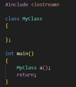 most vexing parse 이하 성가신 파싱은 선언으로 해석할 수 있는 것은 선언으로 해석해야 한다.는 규칙이다.예를 들어 아래같은 코드를 보자. 여기서 MyClass a() 를 생각해보자.이 구문은 2가지로 해석될 여지가 있다. 1. 함수 선언2. 객체의 생성 (기본생성자 호출) 그런데 '성가신 파싱'에 의해 무조건 '선언'으로 해석된다. 분명 생성자는 호출했다고 생각했는데생성자가 호출이 안된 것을 볼 수 있다. 따라서 '성가신 파싱'을 회피하기 위해서 객체를 선언하고 싶다면 언제나 중괄호 초기화를 사용하는 것을 권장한다.