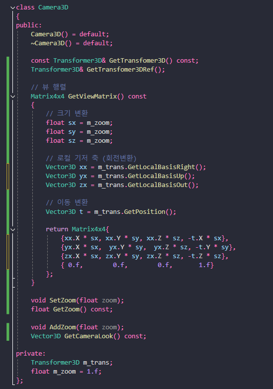3D 카메라 수정제가 사용하는 3D 카메라 입니다. 카메라의 모델링 행렬로 부터 뷰 행렬을 얻어냅니다.뷰 행렬은 카메라 모델링 행렬의 역행렬이고, 이를 모든 오브젝트에 곱합니다. 이를 뷰 변환이라고 부릅니다. 윈도우 자체는 원점을 기준으로 그릴 것이므로카메라의 시점을 윈도우에 그리기 위해서는, 카메라가 변환된 만큼 월드를 역변환해야 합니다.그러면 카메라의 좌표, 회전, 크기변환 상태가 모두 원상태로 변환되며, 이에 맞추어 다른 물체들도 변환됩니다. 좌표계 설계에 따라서 다르겠지만제가 설정한 좌표계는 양의 Z축 방향에서 바라본다고 생각하고, 렌더링을 수행합니다. 그런데 이러면 카메라의 렌즈랑 마주보는 형태죠 카메라의 형태를 생각하면, 카메라의 후면에 맺힌 영상을 보는 것이 더 직관적일 겁니다. 그래서 ..