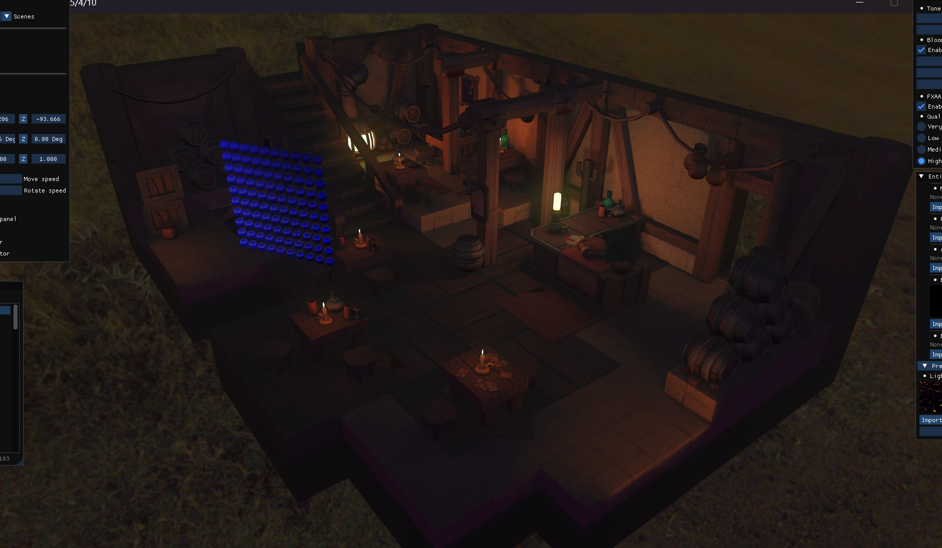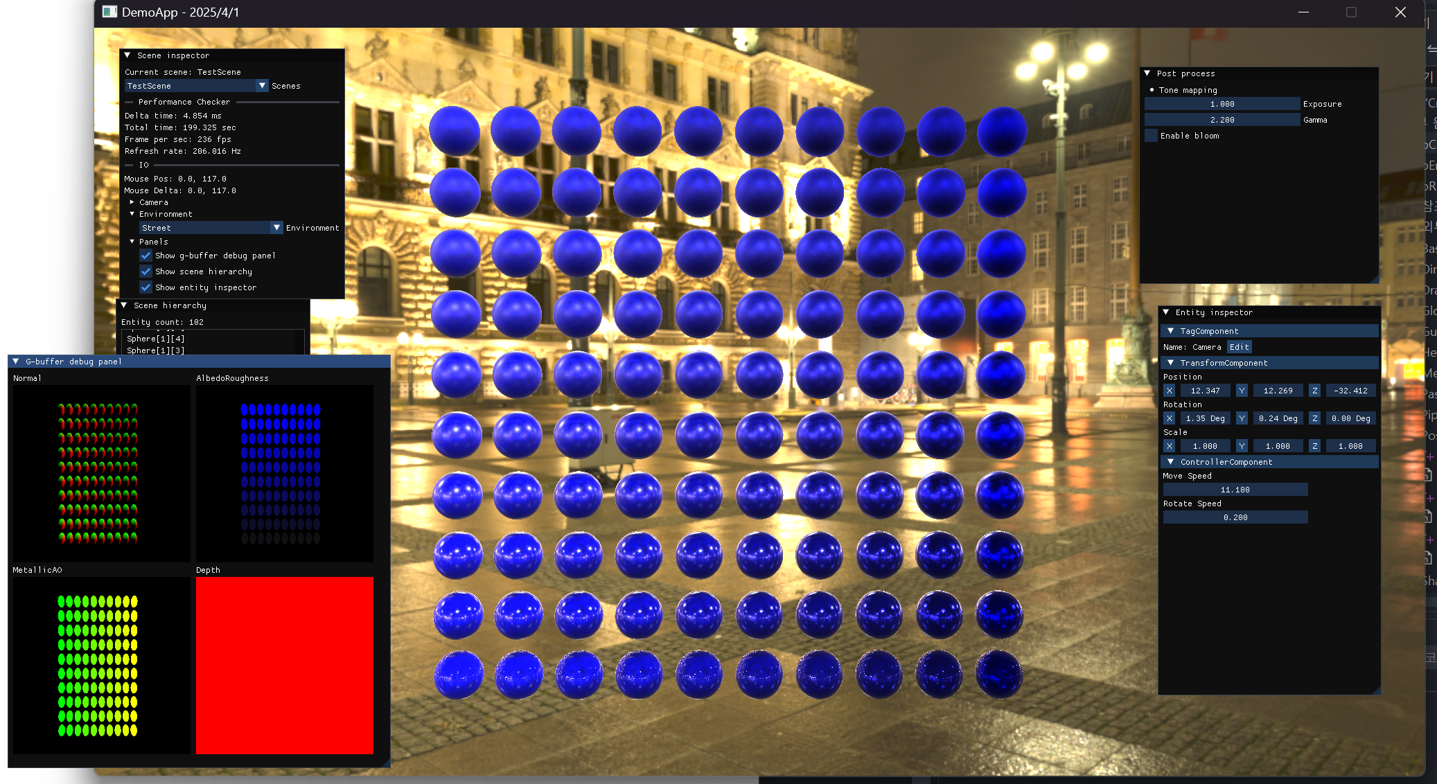 그렇게 눈에 띄는 효과는 아니지만없으면 허전한게 앰비언트 오클루전 인 것 같습니다. 반구형 오프셋 커널을 만들어서현재 픽셀을 일정 오프셋만큼 이동시켜줍니다.그 다음 해당 픽셀의 깊이와 뎁스 버퍼에 저장된 깊이를 비교하여뎁스 버퍼에 저장된 깊이가 더 얕다면 오클루전 팩터에 1씩 더합니다. 이것은 현재 픽셀 주변에 나를 가리는 차폐체가 있다는 것을 의미합니다. 그렇게 게산하면 이 장면에서  이렇게 차폐 정도를 계산할 수 있습니다. 이걸 라이팅 과정에서 앰비언트 부분에 곱해주면 SSAO 완성입니다.  좌: AO 가 적용되지 않음우: AO 가 적용됨 차이가 좀 있는지요..?제 눈에는 조금 납니다  좌: AO 가 적용되지 않음우: AO 가 적용됨 현재는 샘플링수가 64, 노이즈의 크기는 4입니다. 꽤나 고품질이죠..